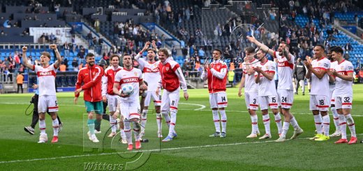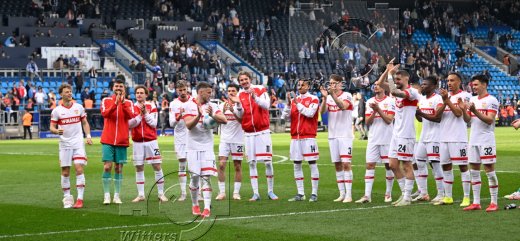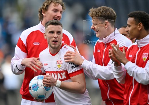 Schlussjubel, v.l. Ramon Hendriks, Ermedin Demirovic, Finn Jeltsch (Stuttgart)