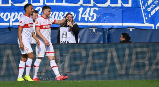 0:3 Tor, Jubel, v.l. Tim Oermann (Bochum), Jeff Chabot, Chris Fuehrich, Torschuetze Ermedin Demirovic (Stuttgart)