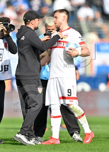 Schlussjubel, v.l. Trainer Sebastian Hoeness (Stuttgart), Ermedin Demirovic (Stuttgart)