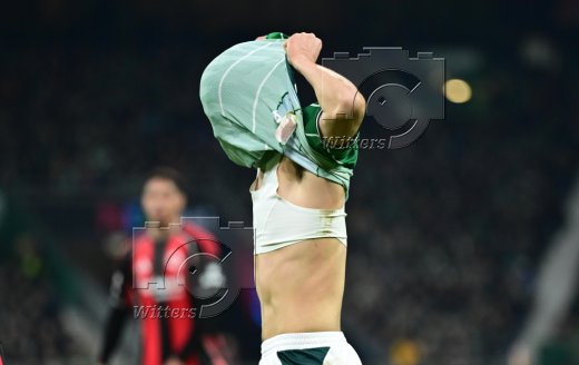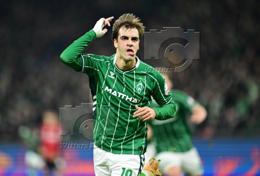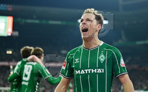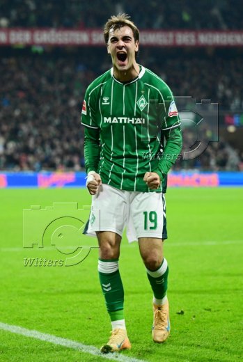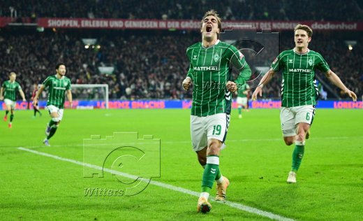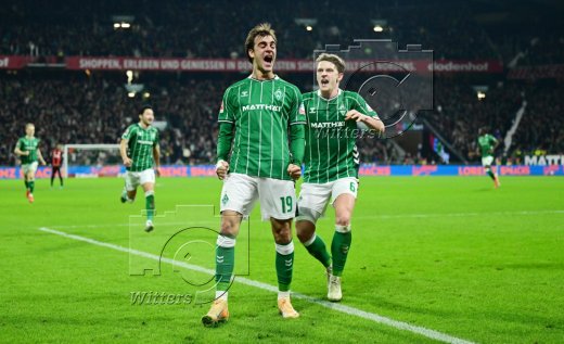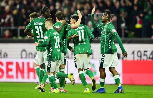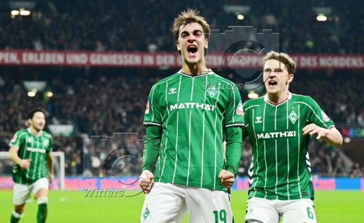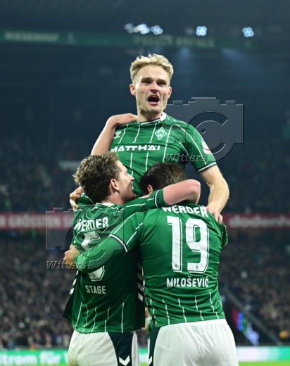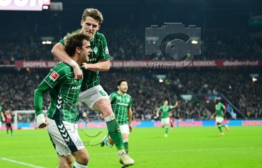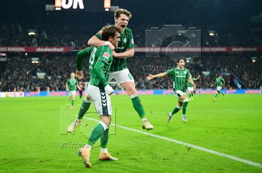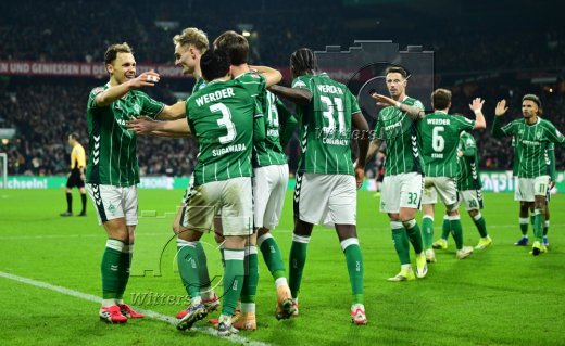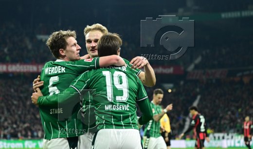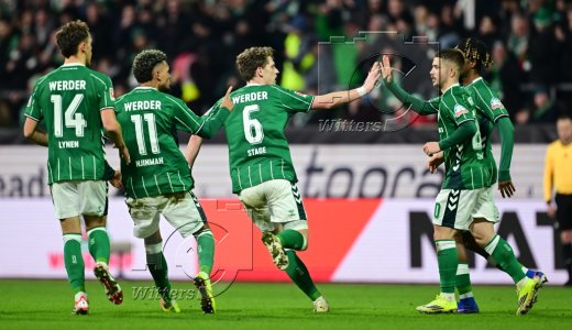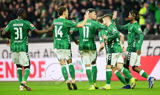 2:2 Tor, Jubel, v.l. Senne Lynen, Justin Njinmah, Torschuetze Jens Stage, Romano Schmid, Samuel Mbangula (Bremen)