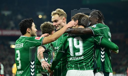 3:2 Tor, Jubel, v.l. Senne Lynen, Amos Pieper, Yukinari Sugawara, Torschuetze Jovan Milosevic, Karim Coulibaly (Bremen)