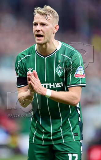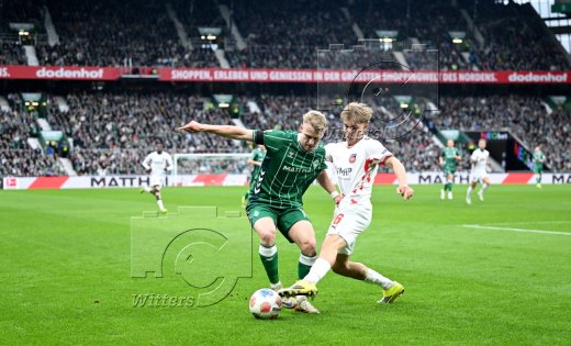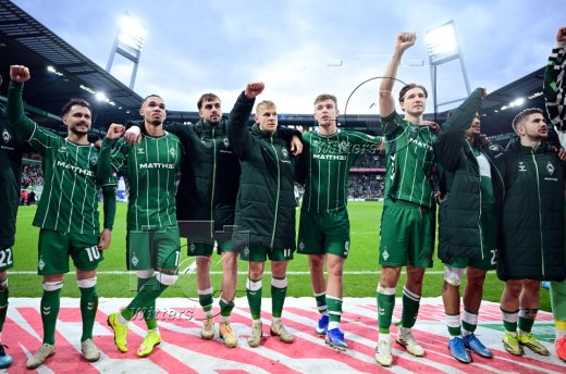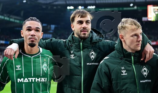 Schlussjubel v.l. Leonardo Bittencourt, Justin Njinmah, Jovan Milosevic, Marco Gruell, Keke Topp, Niklas Stark, Isaac Schmidt, Romano Schmid (Bremen)