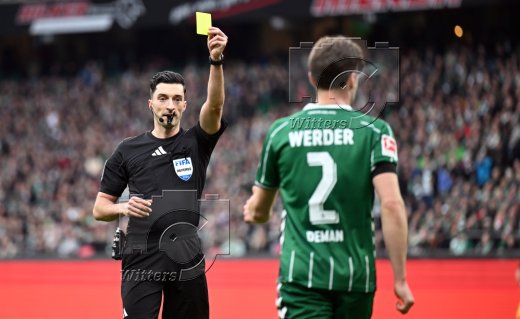v.l. Schiedsrichter Florian Badstuebner zeigt Olivier Deman (Bremen) die gelbe Karte