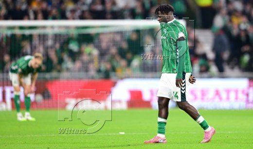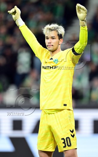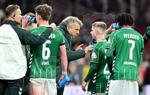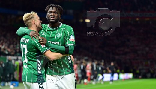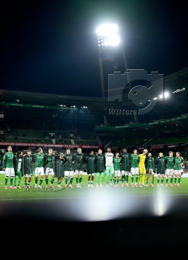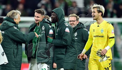Schlussjubel v.l. Trainer Horst Steffen, Marco Friedl, Victor Boniface, Torwart Mio Backhaus (Bremen)