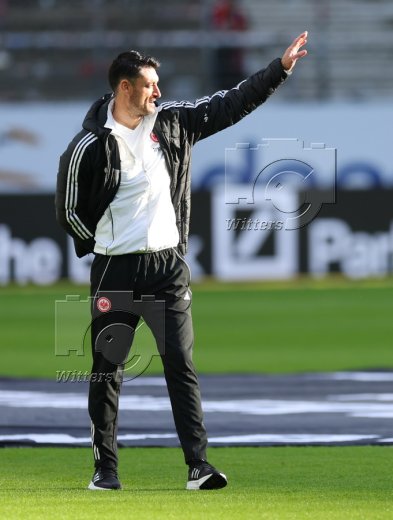 Schlussjubel, Trainer Albert Riera (Frankfurt), Maskottchen Steinadler Attila (Frankfurt)