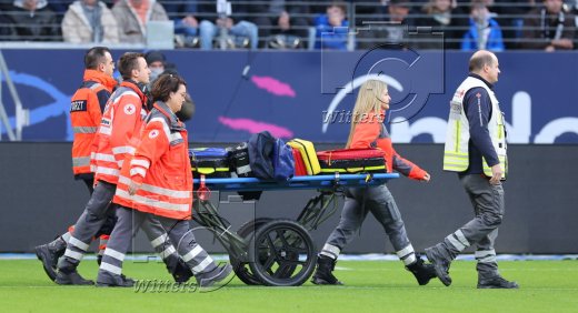 Deutsche Rotes Kreuz, Notarzt, Sanitaeter auf dem Weg zum verletzten Torwart Kaua Santos (Frankfurt)
