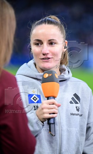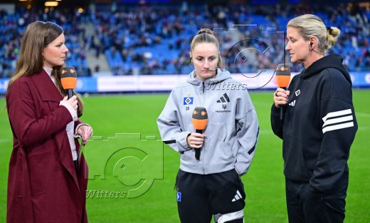 v.l. Moderatorin Amelie Stiefvatter (ZDF), Torfrau Laura Sieger (HSV), Saskia Breuer (Koordinatorin Frauenfussball, HSV)