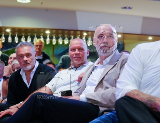 v.l. Stadionsprecher Christian ''Stuebi'' Stuebinger (HSV), Frank Pagelsdorf, Armin Reutershahn