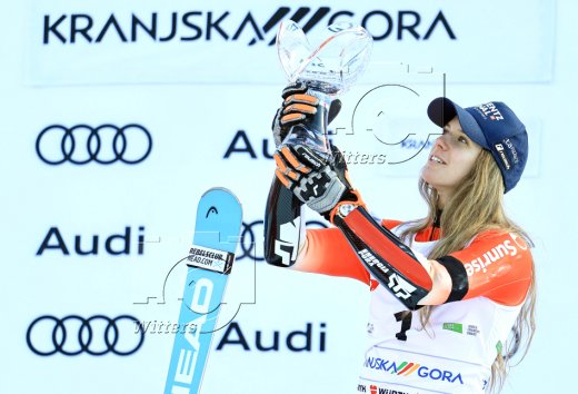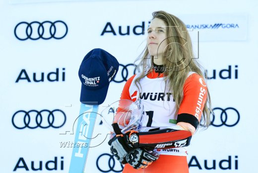 Siegerin Camille Rast (Schweiz) mit Trauerflor in Gedenken an die Opfer der Brandkatastrophe von Crans Montana