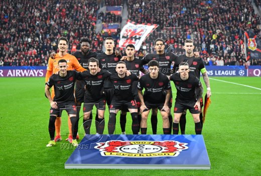 Team Leverkusen, hinten v.l. Torwart Janis Blaswich (Leverkusen), Edmond Tapsoba, Patrik Schick, Exequiel Palacios, Jarell Quansah, Robert Andrich vorn v.l. Lucas Vazquez, Jonas Hofmann, Aleix Garcia, Ibrahim Maza, Alejandro Grimaldo