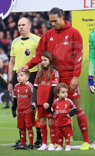 Virgil van Dijk (Liverpool) mit Dinis (vorn l.) und Duarte (vorn r.), Soehne des verstorbenen Mitspielers Diogo Jota