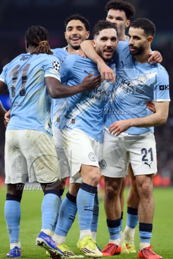 2:0 Jubel v.l. Jeremy Doku, Omar Marmoush, Torschuetze Rayan Cherki, Rayan Ait-Nouri (City)