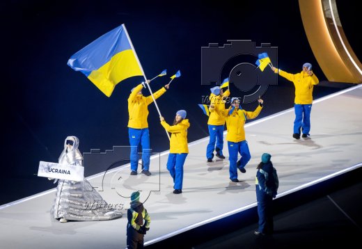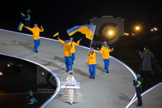 Team Ukraine mit Fahnentraegerin Jelysaweta Sydjorko (Shorttrack)