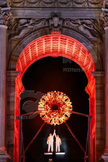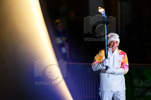 Fackeltraeger Alberto Tomba (Ski Alpin, Italien) und Fackeltraegerin Deborah Compagnoni (Ski Alpin, Italien) entzuenden das Olympische Feuer am Arco della Pace