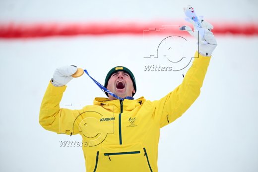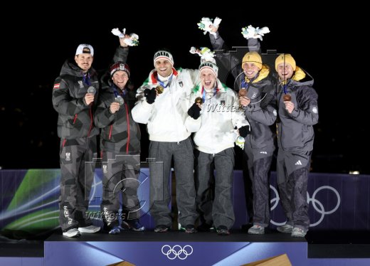 v.l. Thomas Steu, Wolfgang Kindl (Oesterreich, Silber), Olympiasieger Emanuel Rieder, Simon Kainzwaldner (Italien, Gold), Tobias Wendl, Tobias Artl (Deutschland, Bronze)