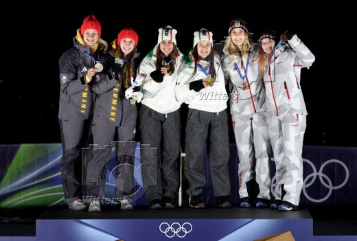 v.l. Dajana Eitberger, Magdalena Matschina (Deutschland, Silber), Olympiasiegerinnen Andrea Voetter, Marion Oberhofer (Italien, Gold), Selina Egle, Lara Michaela Kipp (Oesterreich, Bronze)