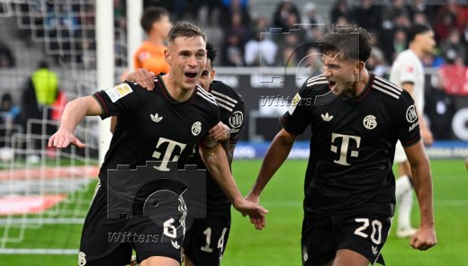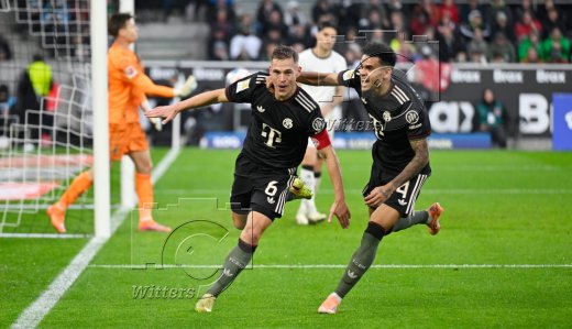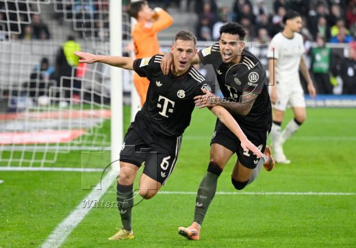 0:1 Tor, Jubel, v.l. Torschuetze Joshua Kimmich, Luis Diaz, Tom Bischof (Bayern)