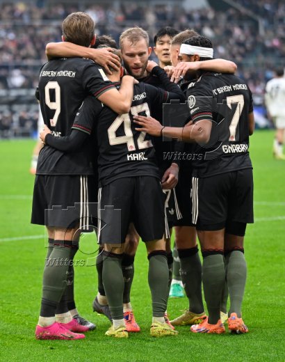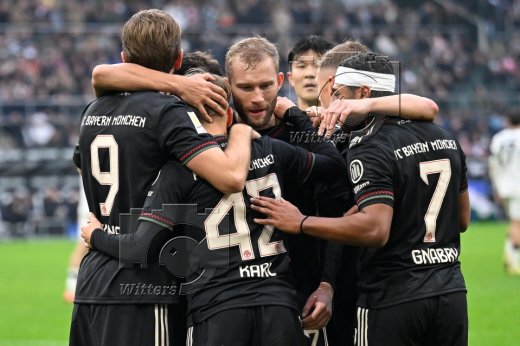 0:3 Tor, Jubel, v.l. Harry Kane, Michael Olise, Leon Goretzka, Tom Bischof, Torschuetze Lennart Karl, Serge Gnabry (Bayern)