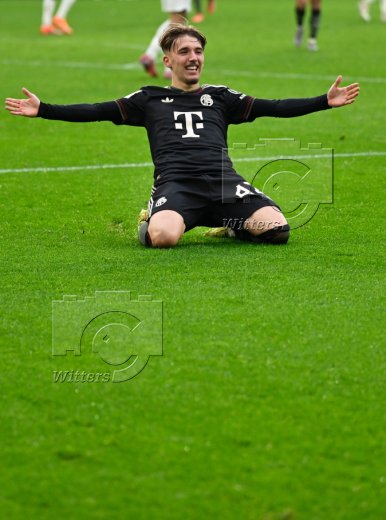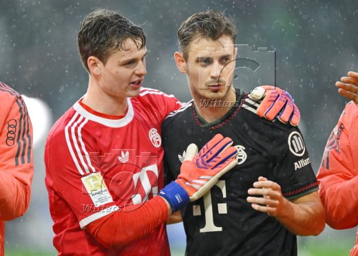 Schlussjubel, v.l. Torwart Jonas Urbig, Josip Stanisic (Bayern)