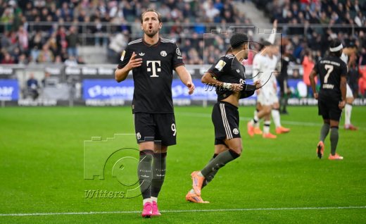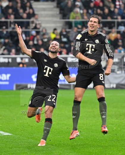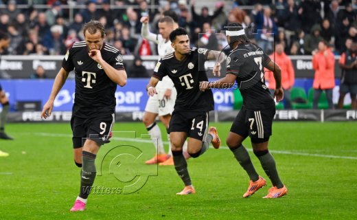 0:2 Tor, Jubel, v.l. Harry Kane, Luis Diaz, Torschuetze Raphael Guerreiro (Bayern, verdeckt), Torwart Moritz Nicolas (Gladbach)