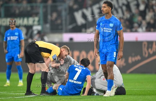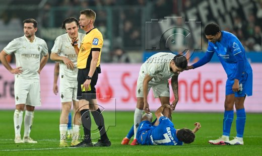 v.l. Kevin Stoeger, Rocco Reitz, Schiedsrichter Christian Dingert, Kevin Diks (Gladbach), Verletzung Jonas Hofmann (Leverkusen), Jarell Quansah