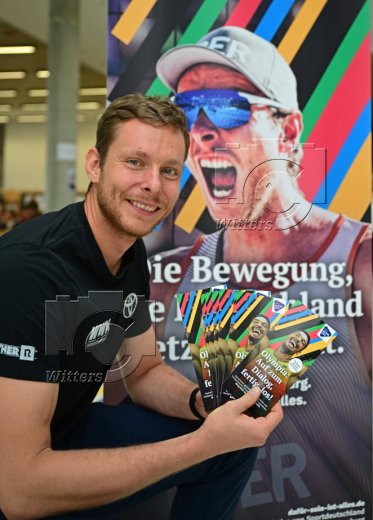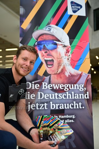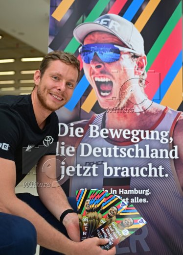 v.l. Nils Ehlers (Beachvolleyball) vor seinem Plakat