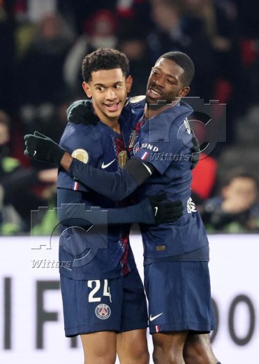 2:1 Tor, Jubel, v.l. Desire Doue, Torschuetze Ousmane Dembele, Torschuetze Senny Mayulu (PSG)