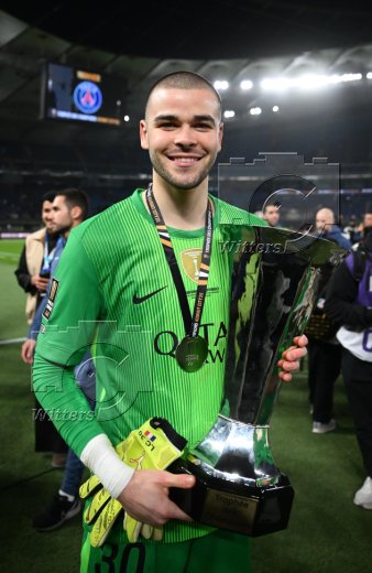 PSG Supercup-Sieger 2025, Torwart Lucas Chevalier mit Pokal