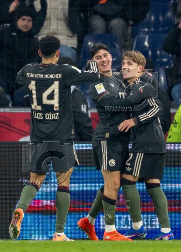 0:2 Tor, Jubel, v.l. Luis Diaz, Felipe Chavez, Torschuetze Lennart Karl (Bayern)