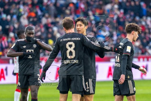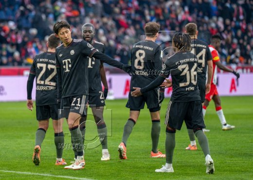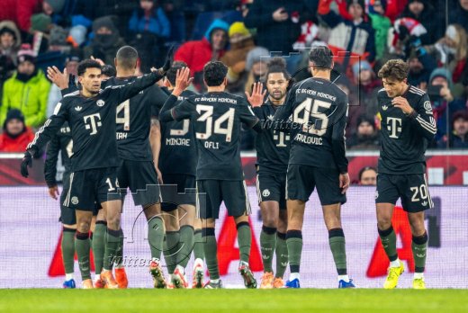 Jubel, v.l. Luis Diaz, Jonathan Tah, Min-Jae Kim, Deniz Ofli, Serge Gnabry, Aleksandar Pavlovic, Tom Bischof (Bayern)