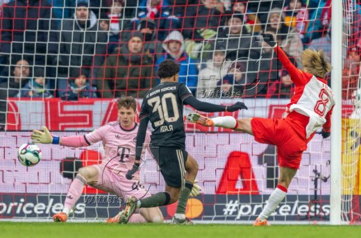 v.l. Torwart Jonas Urbig (Bayern), Cassiano Kiala, Sota Kitano (Salzburg)