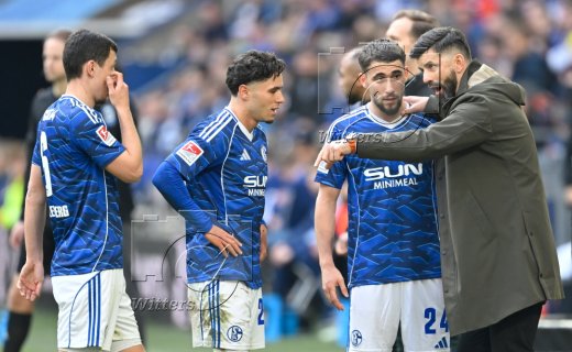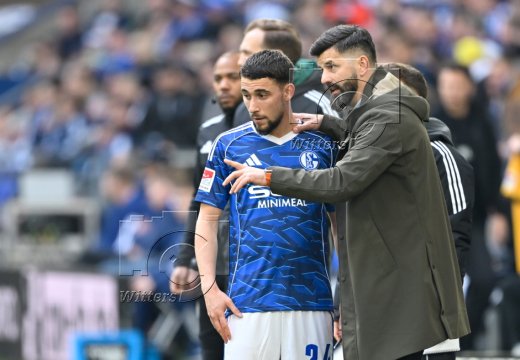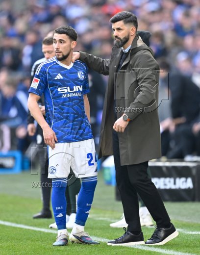 v.l. Adil Aouchiche, Trainer Miron Muslic (Schalke)