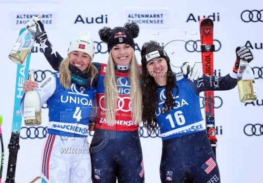 v.l. Kajsa Vickhoff Lie (Norwegen, 2. Platz), Siegerin Lindsey Vonn (USA) Jacqueline Wiles (USA, 3. Platz)
