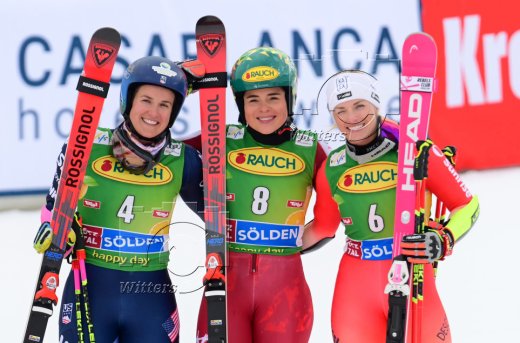 v.l. Paula Moltzan (USA, 2. Platz), Siegerin Julia Scheib (Oesterreich), Lara Gut-Behrami (Schweiz, 3. Platz)