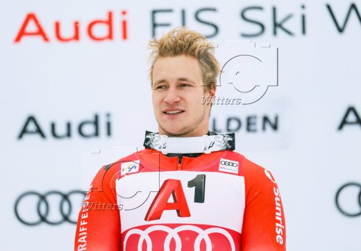 v.l. Marco Schwarz (Oesterreich, 2. Platz), Sieger Marco Odermatt (Schweiz), Atle Lie McGrath (Norwegen, 3. Platz)