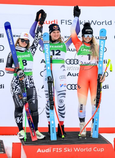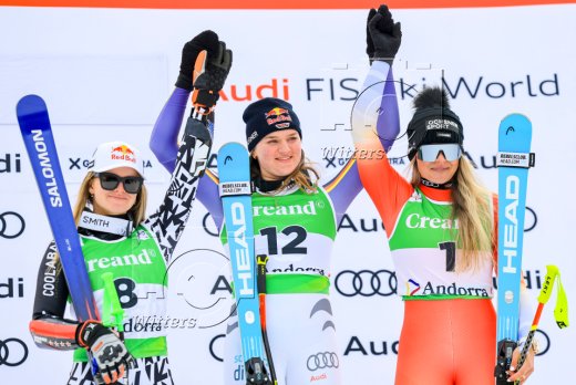 v.l. Alice Robinson (Neuseeland, 2. Platz), Siegerin Emma Aicher (Deutschland), Corinne Suter (Schweiz, 3. Platz) Soldeu, 28.02.2026, Ski Alpin, FIS Weltcup Soldeu / Andorra 2026, Super G Damen