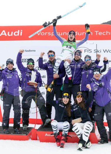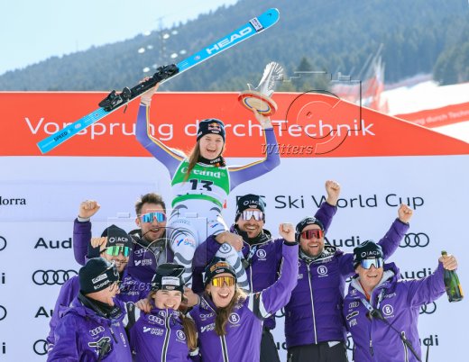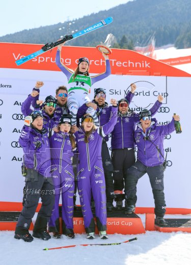Siegerin Emma Aicher (Deutschland) mit Team Soldeu, 28.02.2026, Ski Alpin, FIS Weltcup Soldeu / Andorra 2026, Super G Damen