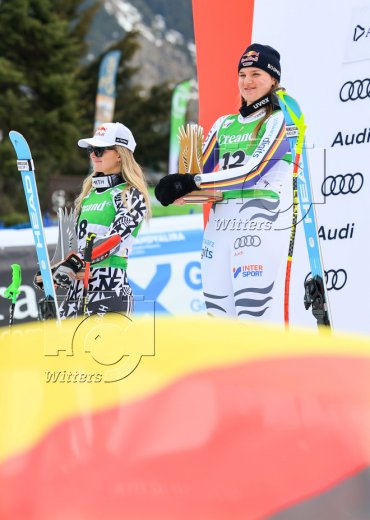 v.l. Alice Robinson (Neuseeland, 2. Platz), Siegerin Emma Aicher (Deutschland) Soldeu, 28.02.2026, Ski Alpin, FIS Weltcup Soldeu / Andorra 2026, Super G Damen