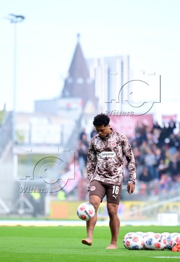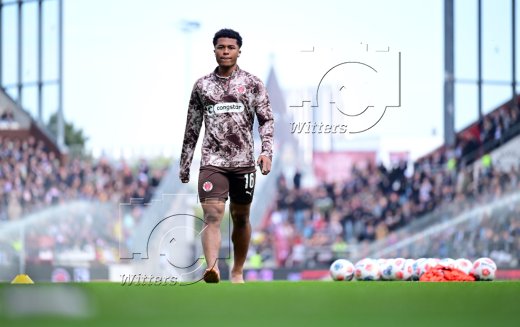 Joel Chima Fujita (St. Pauli) barfuss auf dem Rasen vor Spielbeginn