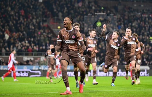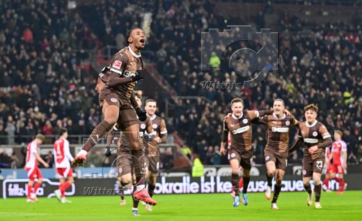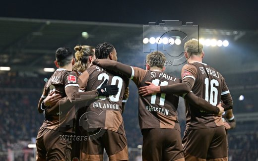 1:0 Tor, Jubel, v.l. Torschuetze Morgan Guilavogui, Noah Weisshaupt, James Sands, Johannes Eggestein, Jackson Irvine, Philipp Treu (St. Pauli)