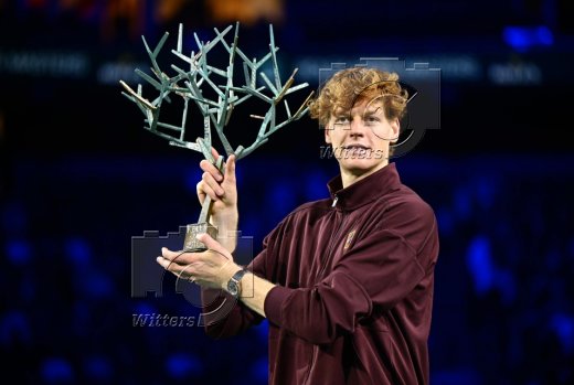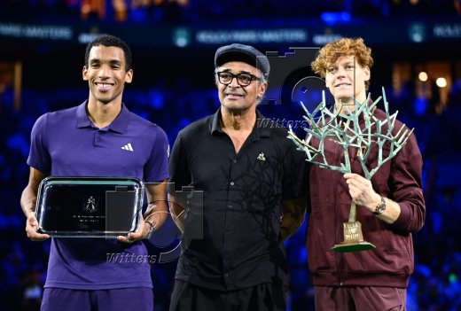 v.l. Finalist Felix Auger-Aliassime (Kanada), Yannick Noah (Frankreich), Sieger Jannik Sinner (Italien)