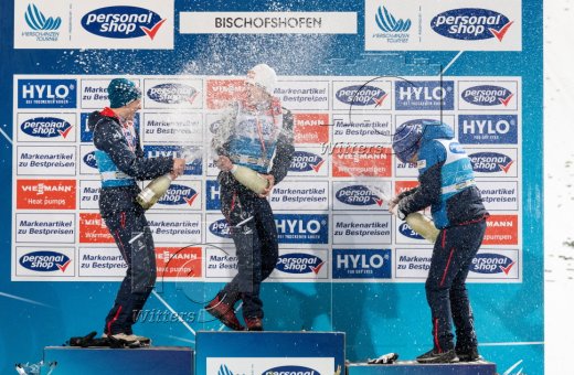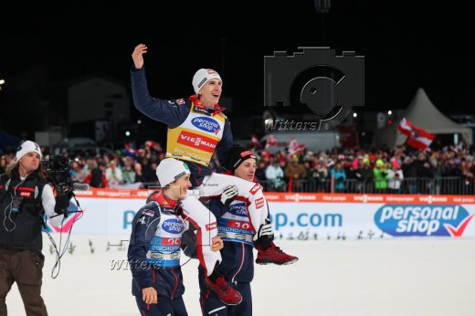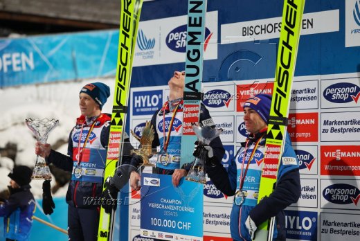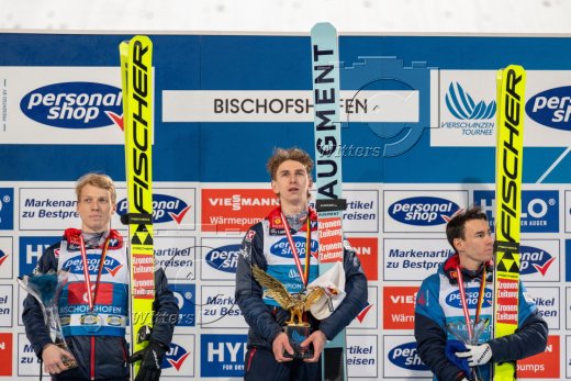 v.l. Jan Hoerl (Oesterreich, 2. Platz), Sieger Daniel Tschofenig (Oesterreich), Stefan Kraft (Oesterreich, 2. Platz)