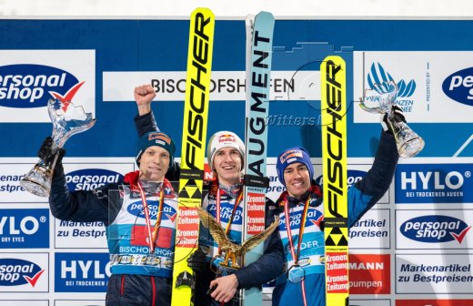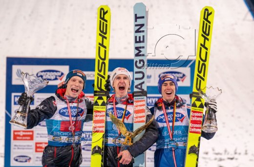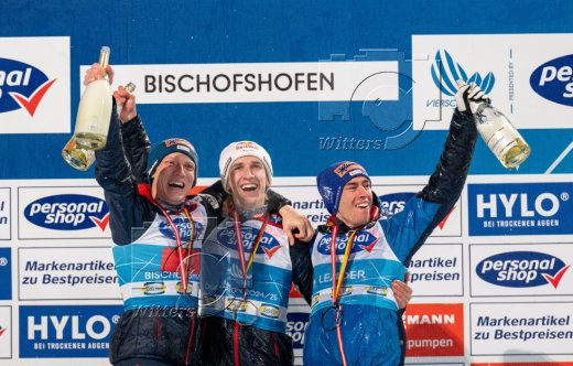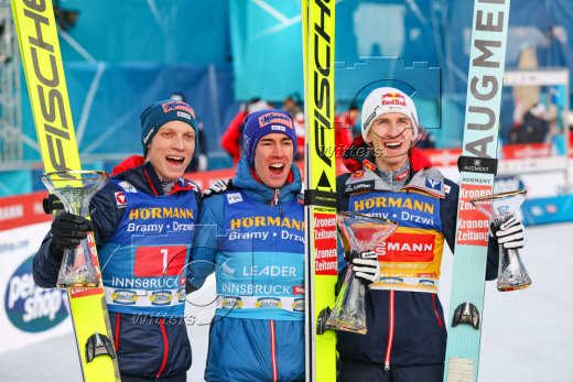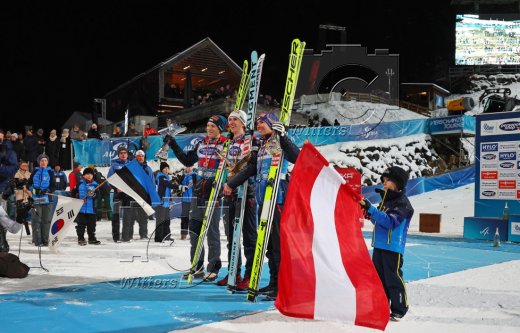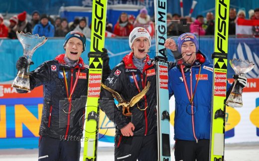 v.l. Jan Hoerl (Oesterreich, 2. Platz), Sieger Stefan Kraft (Oesterreich), Daniel Tschofenig (Oesterreich, 3. Platz)