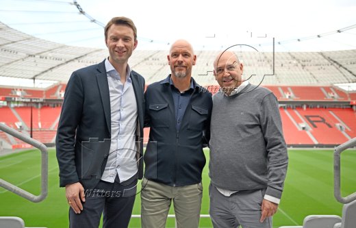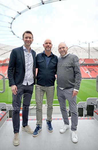 v.l. Simon Rolfes (Geschaeftsfuehrer Sport, Leverkusen), Trainer Erik ten Hag, Geschaeftsfuehrer Fernando Carro (Leverkusen)