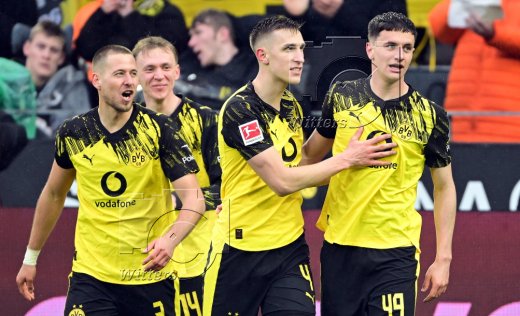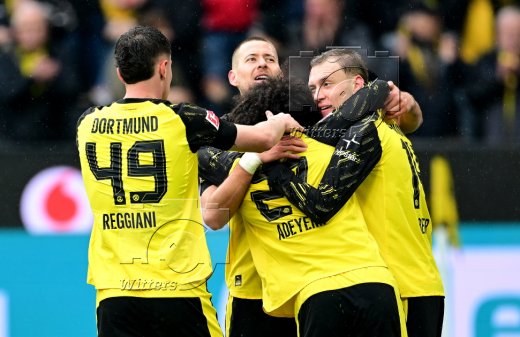 2:0 Tor, Jubel v.l. Waldemar Anton, Maximilian Beier, Nico Schlotterbeck, Torschuetze Luca Reggiani (Dortmund)