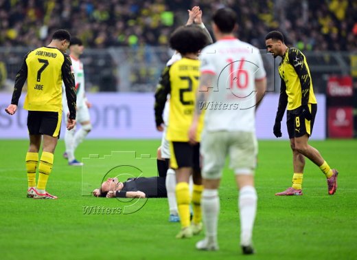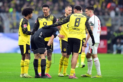 v.l. Jobe Bellingham, Sturz von Schiedsrichter Bastian Dankert nach Zusammenstoss mit Felix Nmecha (Dortmund)