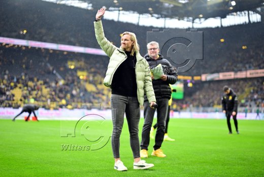 Praesentation von Alexandra Popp (Wolfsburg) als Neuzugang der Frauen von Borussia Dortmund, Stadionsprecher Norbert Dickel (hinten)