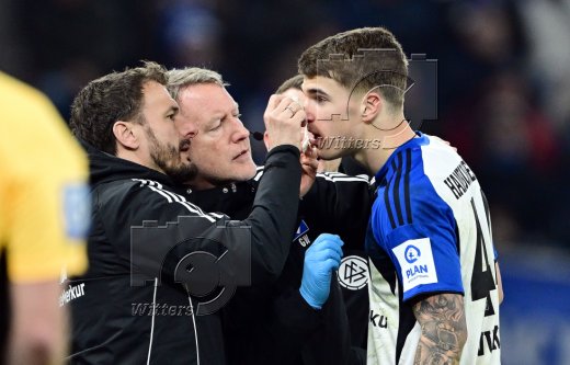 Verletzung v.l. Physiotherapeut Andreas Thum, Mannschaftsarzt Dr. Goetz Welsch, Luka Vuskovic (HSV)