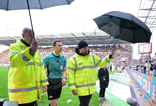 Schiedsrichter Felix Zwayer in Begleitung von Ordnern mit Regenschirmen, Schutz vor Wurfgeschossenen