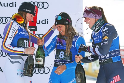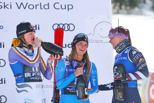 v.l. Emma Aicher (Deutschland, 2. Platz), Siegerin Laura Pirovano (Italien), Breezy Johnson (USA, 3. Platz)